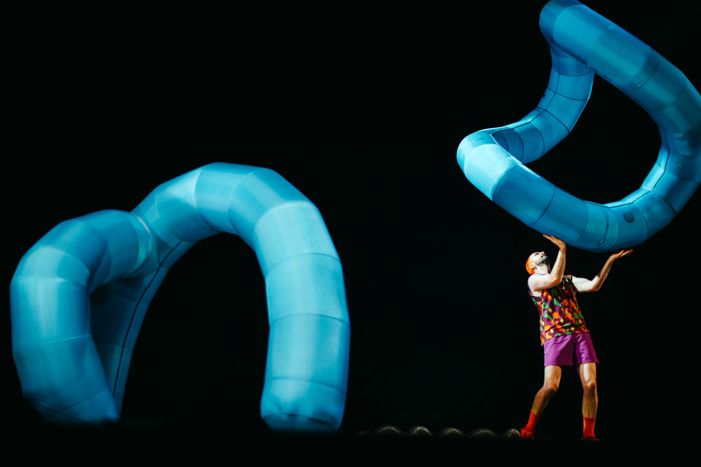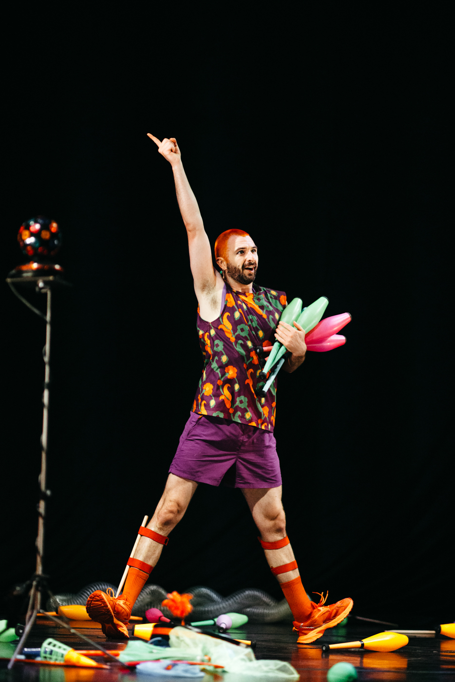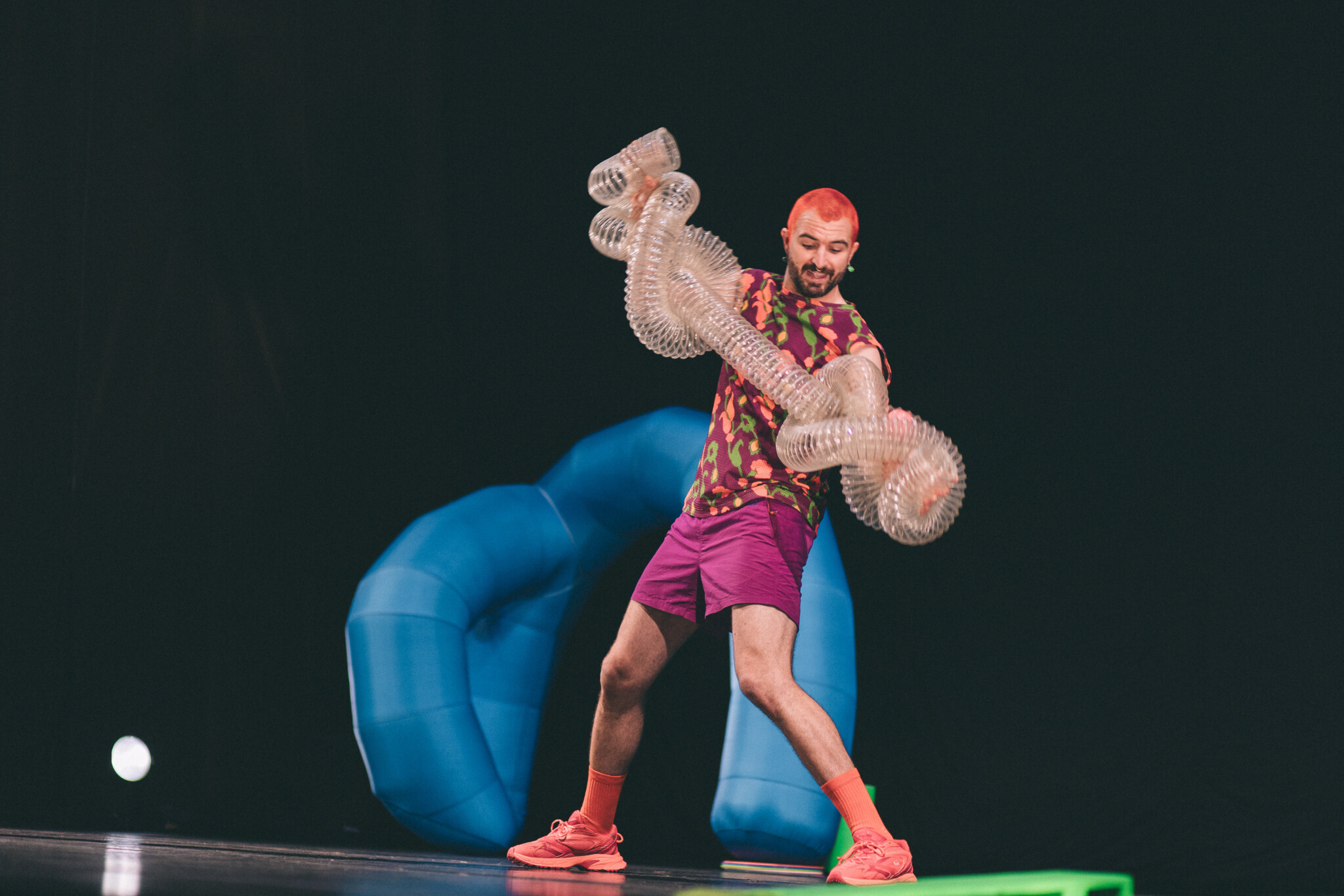 Idźmy dalej, a w zasadzie zapnijmy mocno pasy, bo kolejka do której wsiadamy wykręci nas w kosmos, przeniesie w zupełnie inną galaktykę. U sterów Wes Peden – to znak, że czeka nas jazda bez trzymanki. No i zaczęło się. Feeria kolorów, ale tak pięknie dobranych jak nigdy. Żywych, soczystych. Wybijających jak jaskrawe neony ze scenicznej czerni. Punk, glamour i wata cukrowa. Potem spirale, pętle, obroty. Czy ktoś wiedział, że istnieje tyle kształtów górskich kolejek? Pedenowi udało się je precyzyjnie rozmontować, zdekonstruować i przełożyć na żonglerkę, jednocześnie redefiniując ją samą. Przenosząc w zupełnie inny wymiar. To, co się działo na scenie to czysta performatywna synergia. Bez patetyzmu i odkrywania świata na nowo, ale z czystą dziecięcą ciekawością. Energią Pedena możnaby ładować akumulatory i ogrzewać mieszkania. Tam było wszystko, czego trzeba, a nawet i więcej. Czy właśnie obejrzeliśmy godzinny spektakl o wagonikach? Tak, a głowa wciąż paruje od wrażeń.