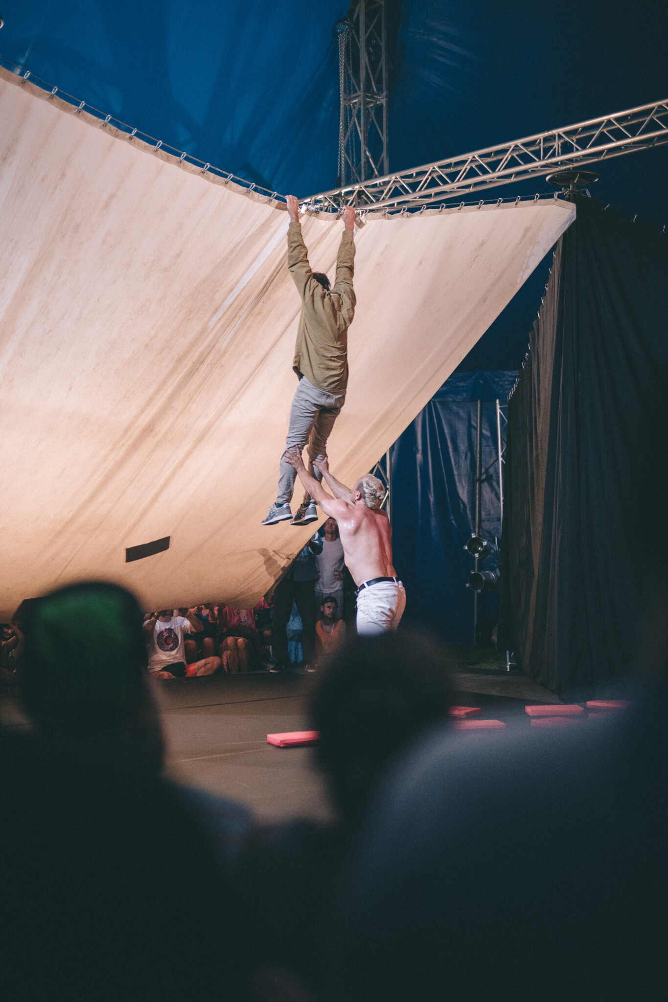 Ale OFCA to nie tylko spektakle. To przede wszystkim przestrzeń spotkania, przenikania się światów i cyrkowej infiltracji. To spotkanie rozgrywa się na wielu poziomach. Rozrywka, edukacja, kultura i przyjemności czasu wolnego. Pod amfiteatrem rozbiła się cyrkowa wioska, gdzie między innymi Fundacja Sztukmistrze prowadziła warsztaty, podczas których każdy i każda mogli spróbować swoich sił na różnych przyrządach i rekwizytach. Dodatkowo oglądać można było występy lokalnych aerialistek oraz variete, w którym wystąpili uczestnicy i uczestniczki polsko-niemieckiego projektu Cyrkowisko. Publiczność mogła również kibicować diabolistom (i diabolistce!) i żonglerom w ich sportowych potyczkach, rozgrywanych wieczorami pod cyrkowym namiotem lub przy świetle księżyca. Sylwia Siedlecka i Grzegorz Kondrasiuk, w trakcie czwartkowego spotkania wokół książki “Circusiana. Otwarcia” włączyli w program element akademickiej perspektywy, podkreślając konieczność kontynuowania badań nad cyrkiem. Działo się mnóstwo! Dla każdego coś dobrego! Wreszcie – OFCA to też jedno z najważniejszych wydarzeń dla cyrkowej społeczności. Miejsce spotkań, nadrabiania towarzyskich zaległości w Barze Żongler, zbierania inspiracji, ale też czystego festiwalowego szaleństwa.