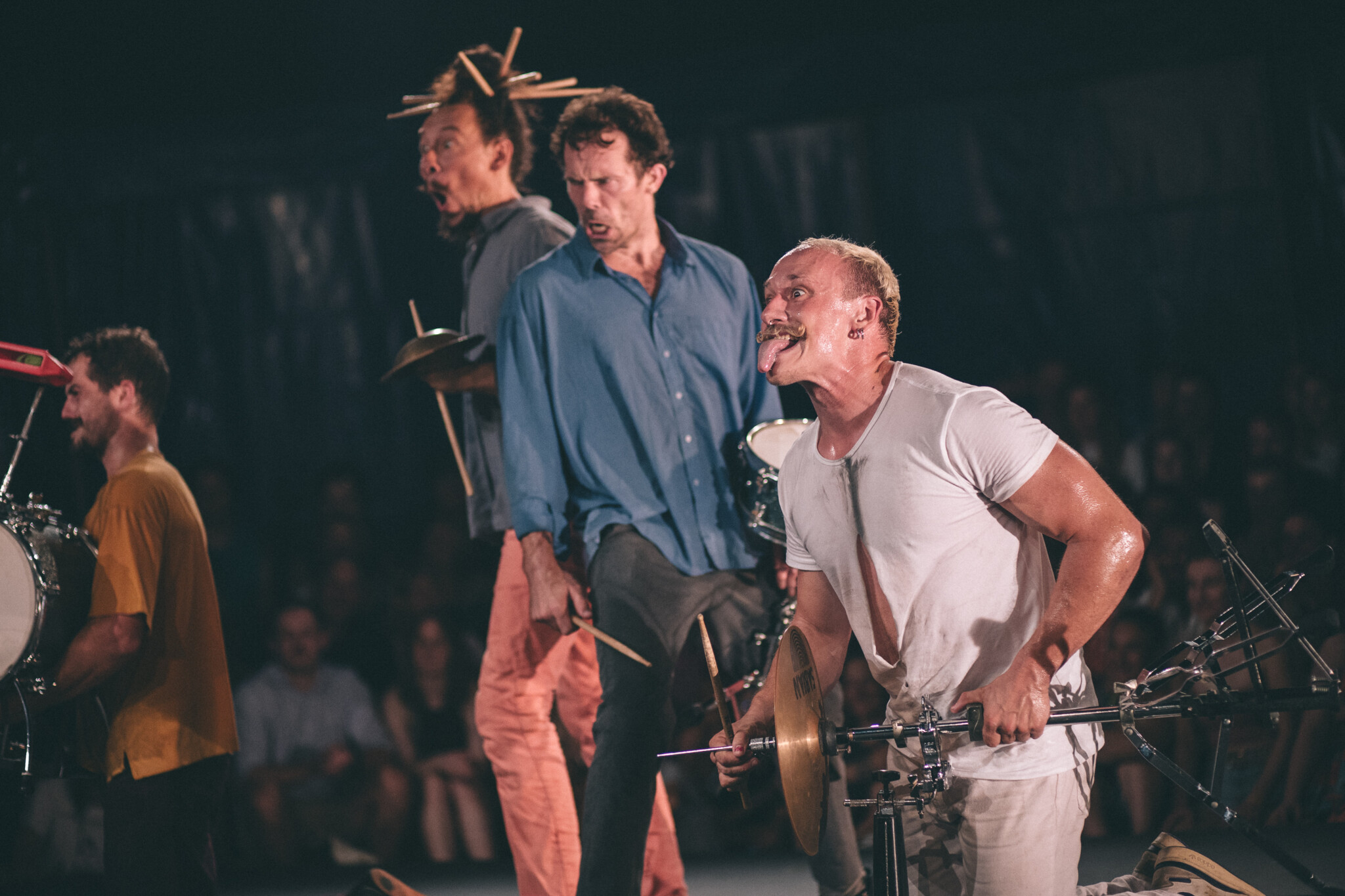 Natomiast buldożerem scenę przejechał kolektyw BeFlat. Metaforycznie oczywiście, ale kto by się spodziewał? Kiedy czytałam o spektaklu, że granice… przekraczanie… sprawdzanie itd. myślałam, że będzie raczej klasycznie. Konceptualne poszukiwania, tożsamość i te sprawy. Na początku trochę tak było, spektakl rozkręcał się powoli. Scena przedzielona kurtyną. Po każdej stronie działo się co innego, więc publiczność łapczywie nasłuchiwała, zazdrośnie podejrzewając, że ci z naprzeciwka mają lepszy repertuar. Początek wydłużony do bólu i kiedy wydawało się, że tak już będzie do końca, to ruszyła ta samonapędzająca się machina chaosu i zmiotła wszystko. Panowie wyprodukowali taki ładunek energii, że chyba wszystkim skoczyło ciśnienie. Adrenalina tryskała na prawo i lewo jak pot z ciał artystów. Granic przekroczyli sporo, bo kiedy wydawało się że więcej już się nie da, to jeszcze podnosili poprzeczkę i intensywność. Tu się zadziało coś bardzo prymarnego, pierwotnego i surowego. Atmosfera gęstniała, buzowała i wyrywała (z) krzesła. Dosłownie. Nagle wszyscy staliśmy się częścią tego przedziwnego rytuału, przewodzonego przez grupę nieprzewidywalnych tricksterów. Finał zawibrował, rozpłynął się jak w maśle, w dźwiękach polifonicznego chóru, uziemiającego powoli rozedrgane wciąż ciała.